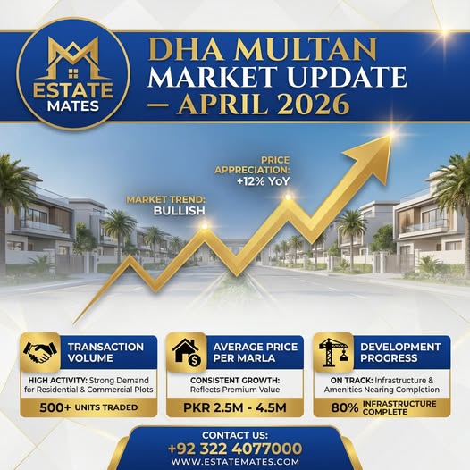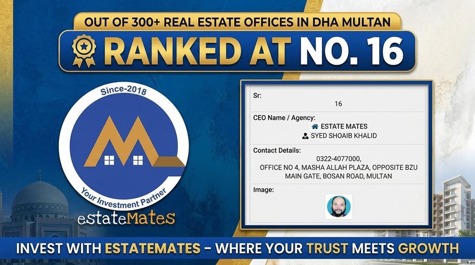 Estate Mates is a professional real estate agency in Multan, offering reliable services in property buying, selling, and leasing. They operate across key locations including DHA Multan, Wapda Town, Gulgasht Colony, and New Multan, providing clients with accurate property valuations, legal documentation support, and investment guidance.
