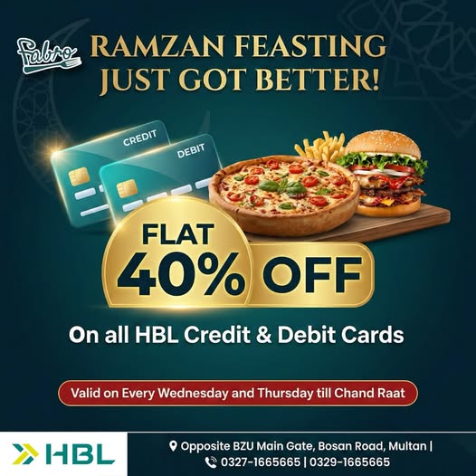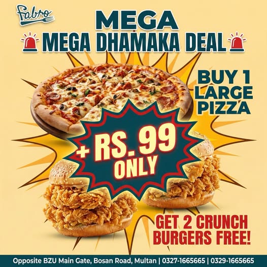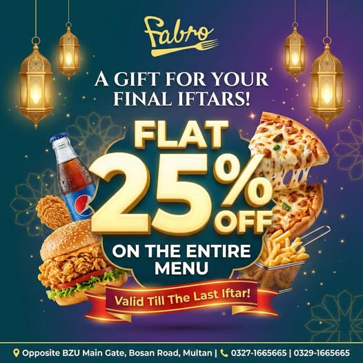 Fabro is a rising food spot in Multan, offering a delicious selection of fast food, including burgers, sandwiches, and loaded fries. Known for their bold flavors and creative menu options, they have quickly become a favorite among young food lovers in the city.
