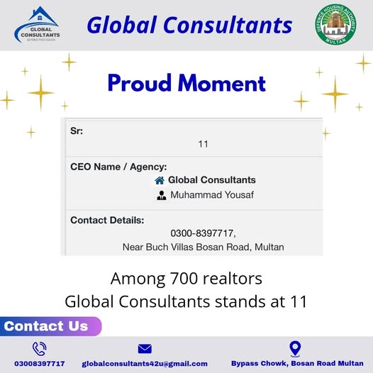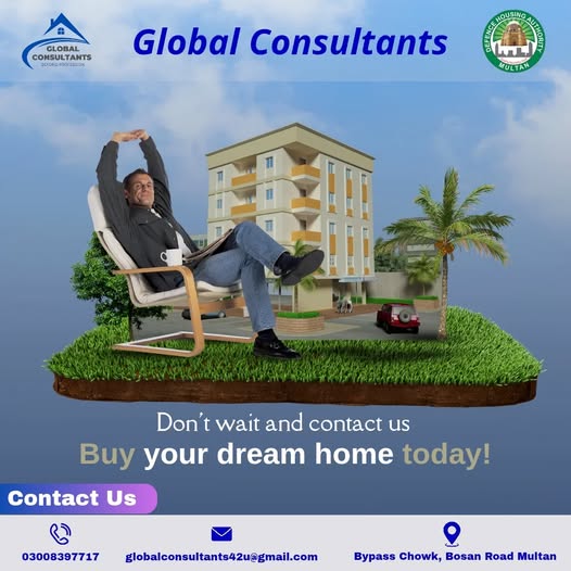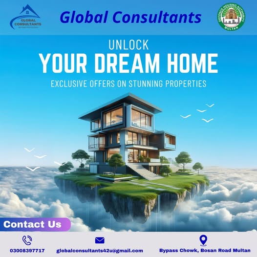 Global Consultants is a professional real estate agency in Multan, offering comprehensive services in property buying, selling, leasing, and investment consulting. They operate across premium locations including DHA Multan, Wapda Town, City Housing, and New Multan, providing clients with market analysis, legal assistance, and property valuation.