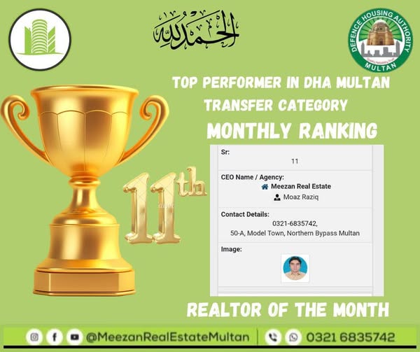 Meezan Real Estate is a trusted real estate agency in Multan, offering professional services in property buying, selling, and leasing. They operate across prime locations including DHA Multan, Wapda Town, Gulgasht Colony, and Shah Rukn-e-Alam Colony, providing clients with accurate property valuations, legal documentation support, and investment guidance.